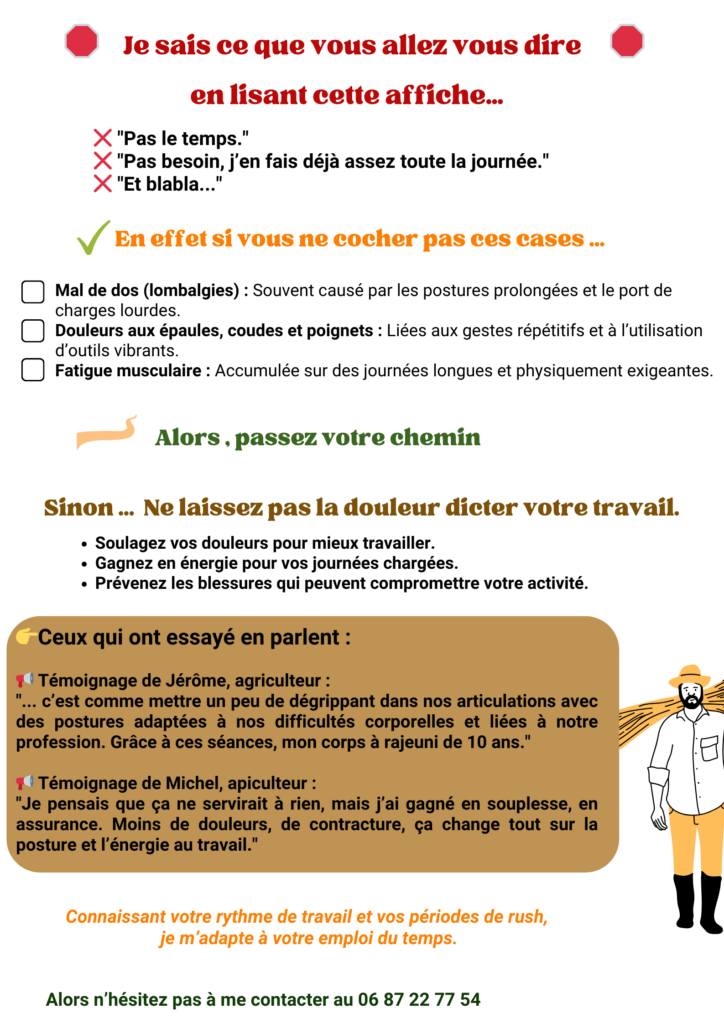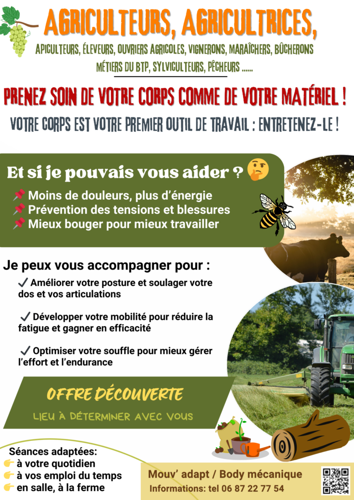 Il s’adresse aux agriculteurs certes mais aussi à d’autres actifs d’autres corps de métiers mais surtout plus particulièrement aux hommes. Ce qui fait que les séances sont adaptés et orientés aux contraintes physiques propres à la leur morphologie et propre à leur métier à l’extérieur et aux contraintes physiques quotidiennes.