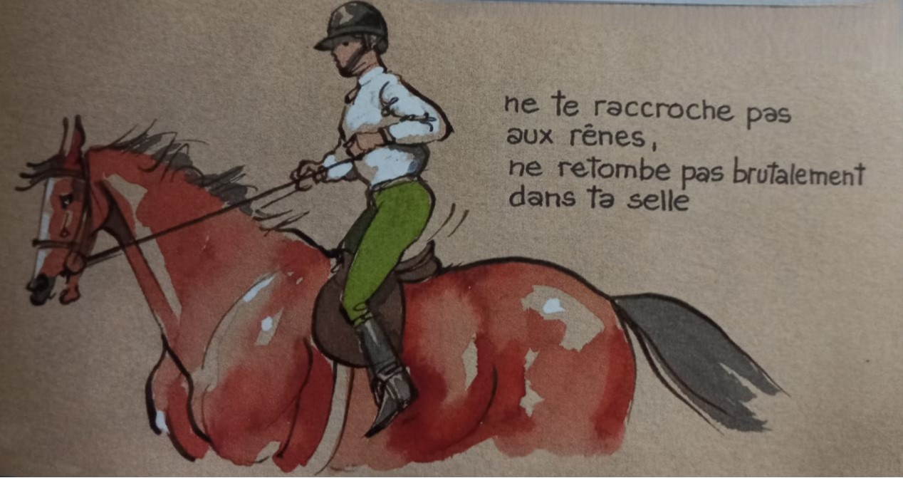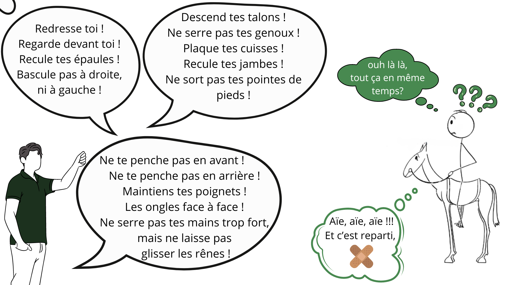 Difficile et désorientant, car il y a beaucoup de choses à coordonner entre la posture, les mouvements, et la gestion du cheval lui-même.
