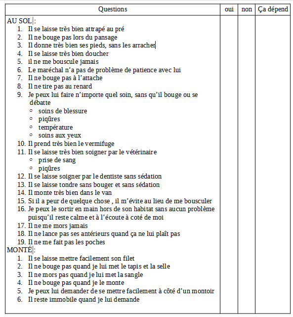 Un cheval bien éduqué, avec ou sans traumatismes devrait répondre en positif à toutes ses questions.